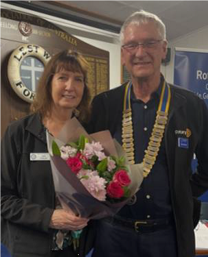 SAA John Spiteri opened the meeting with the invocation and toast to the flag, then welcomed President Peter to the Lectern. Peter spoke about the tremendous night of interaction with Torquay Rotary Club and the local fire brigade, held last week at Freshwater Creek Hall. He particularly thanked Jo and Chris for their organisation of activities and trivia, and Brian and the group for their catering/BBQ efforts. The 2 clubs jointly presented a cheque for $2000 to the Fire Brigade; money raised over the last 2 years. Peter then raved about what an exciting year it’s promising to be for Kaye and him in their profession, he was excited about the tennis, meeting exchange student Ainsley at the airport, what a great place Australia is and how well behaved the endless queues were at the tennis…..he had a captive audience to chat to for hours about the benefits of Rotary! (What a great evangelist). He then shouted us all a glass of bubbly and we toasted Australia, Rotary International and then Kaye and Peter, when Judy announced it was their 40th Wedding Anniversary. Congratulations Kaye and Peter from all club members.